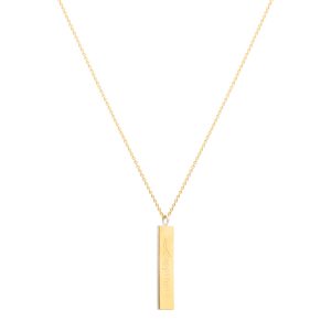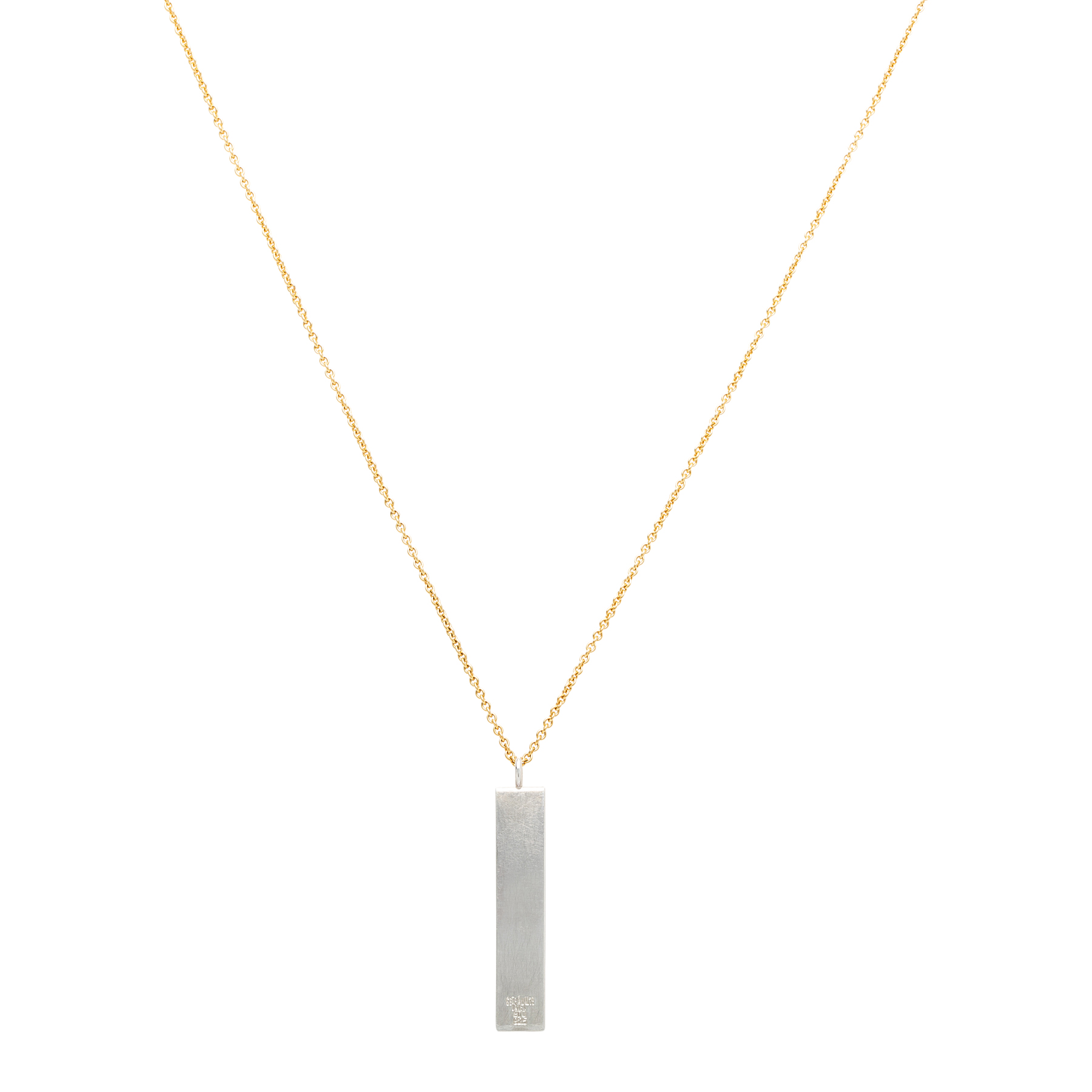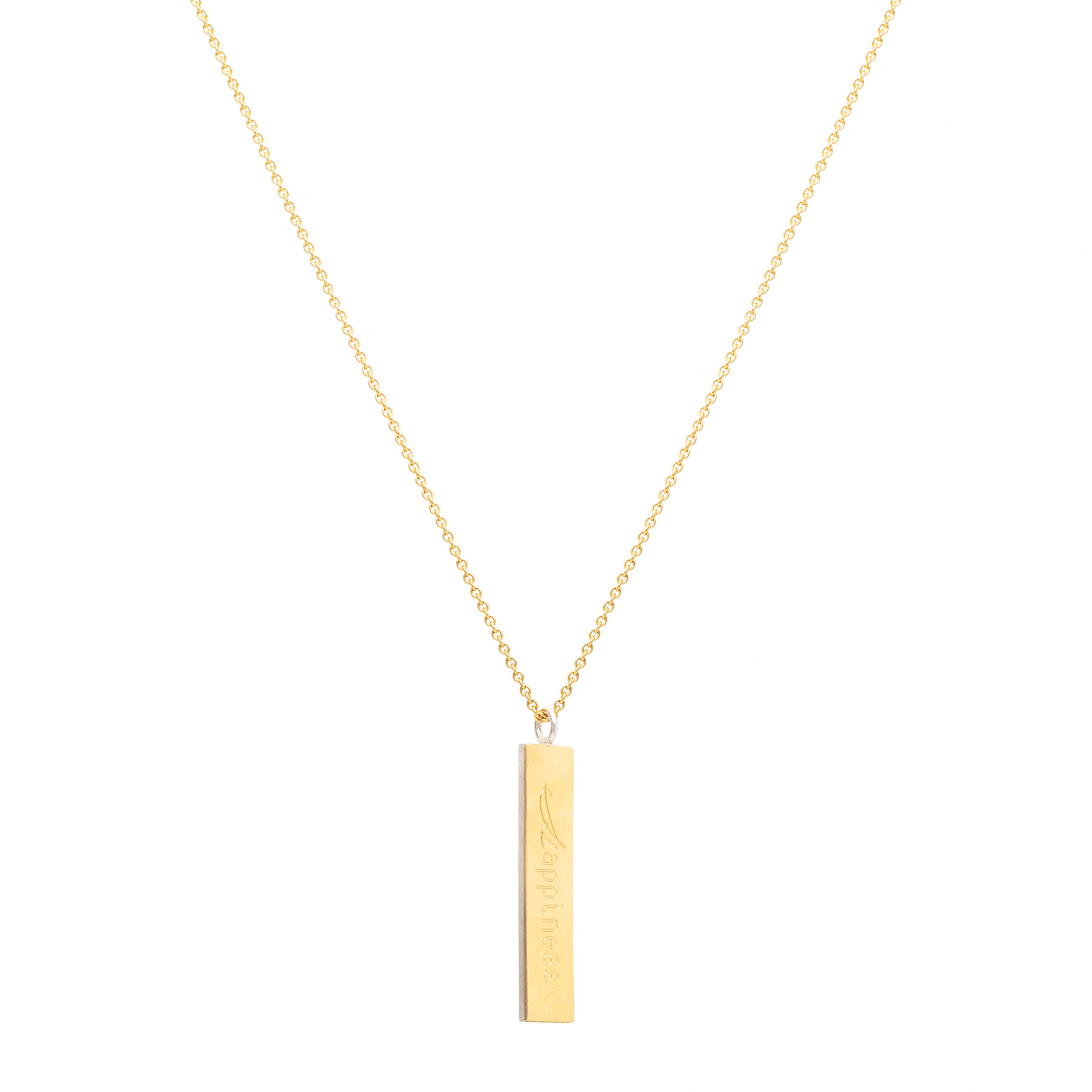 Unser Easy Stripe Anhänger ist ein eleganter rechteckiger bicolor Anhänger aus 925 Sterling Silber mit einer 900er GelbGold Auflage. Auf den Anhänger ist von Hand graviert: Happiness. Die Kette ist aus Tombak golddoubliniert und 43cm lang.