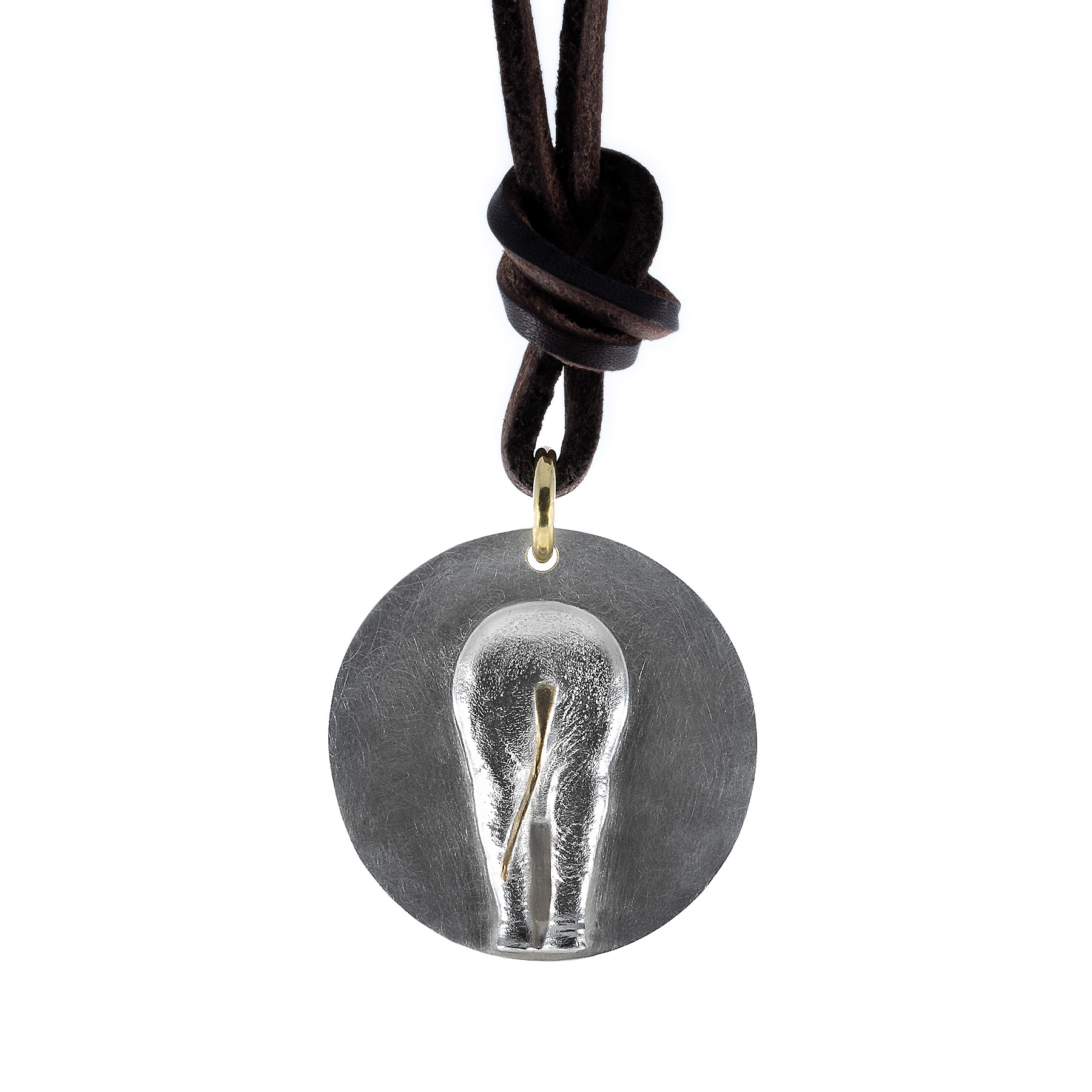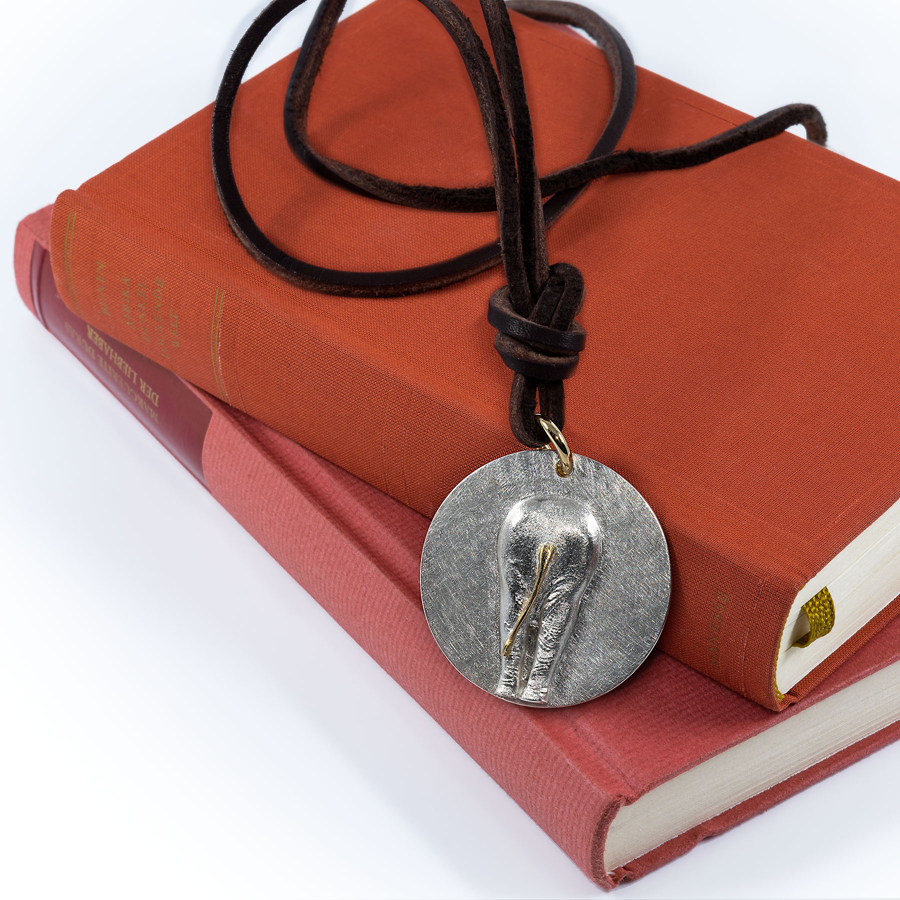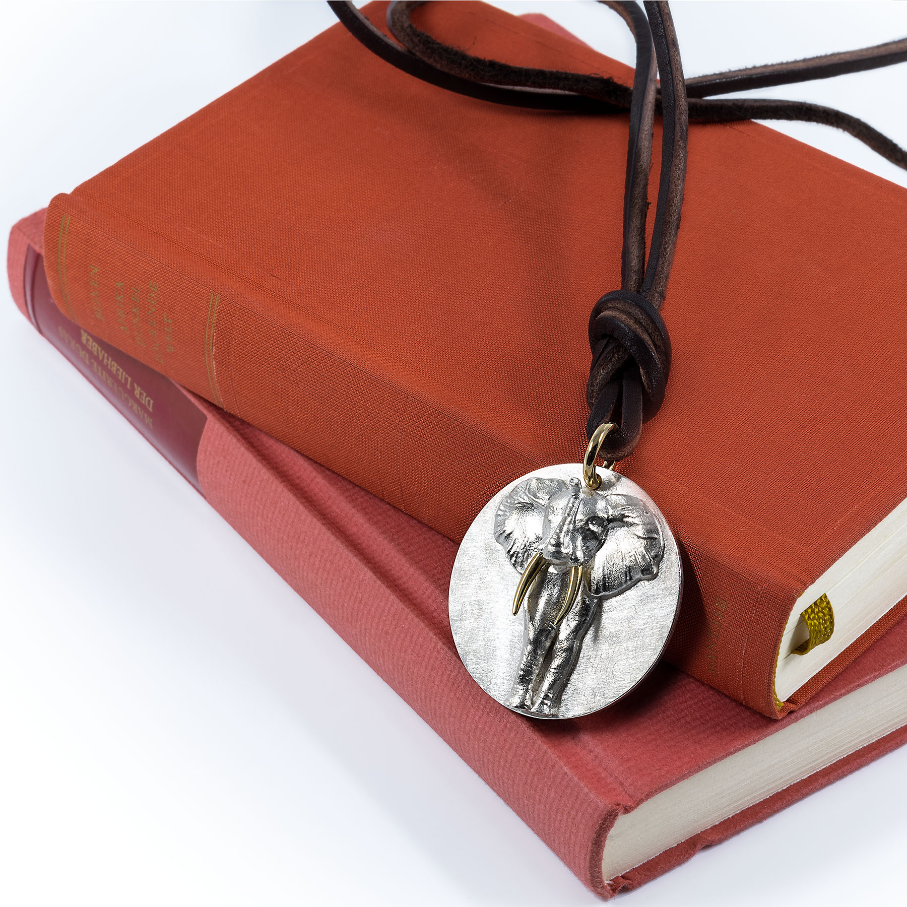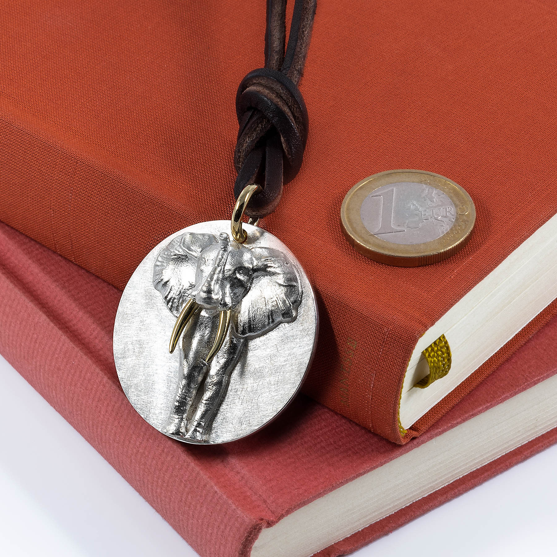Elefant Anhänger 925 Sterling Silber mit Stosszähnen und Öse aus 750 Gelbgold an braunem dicken Natur-Lederband