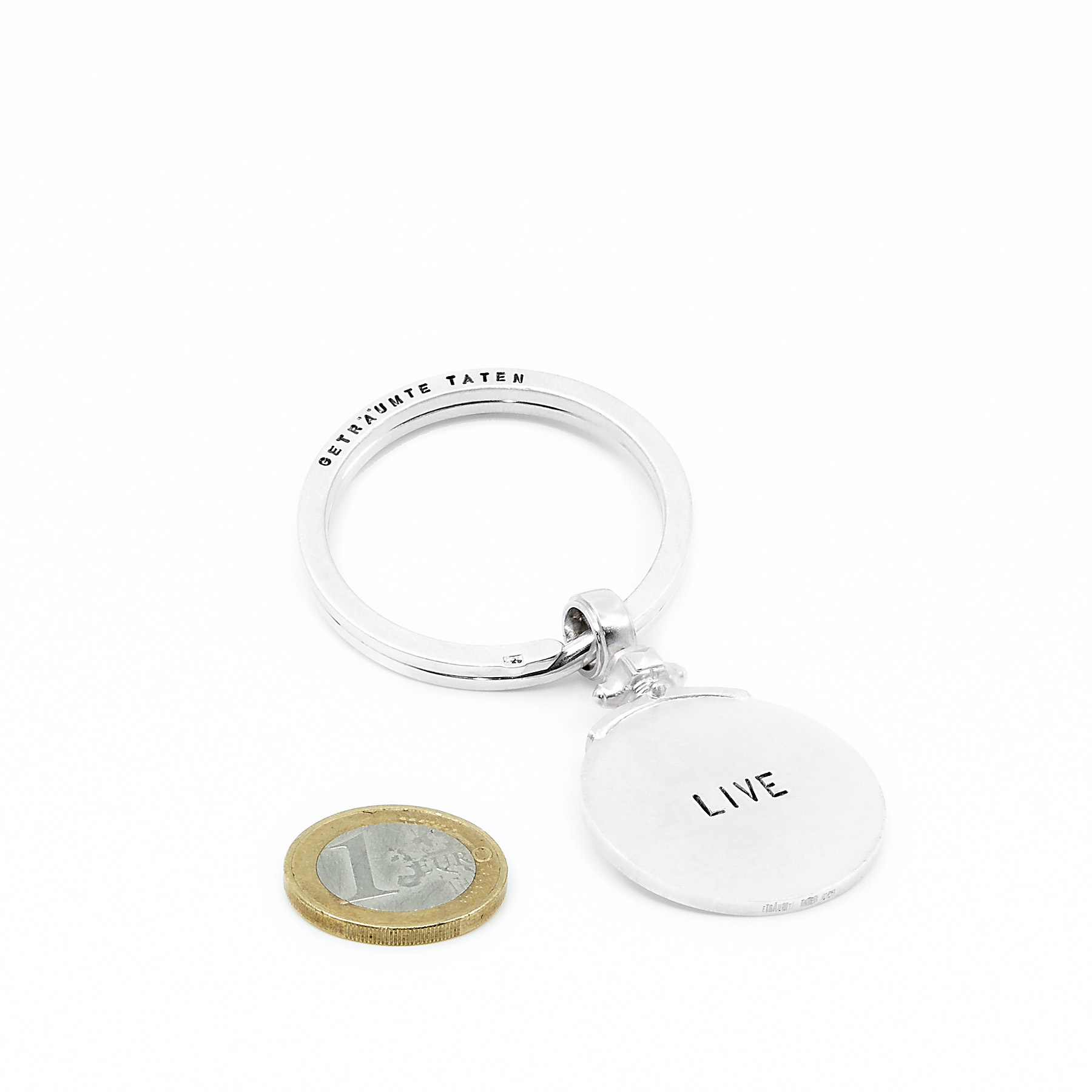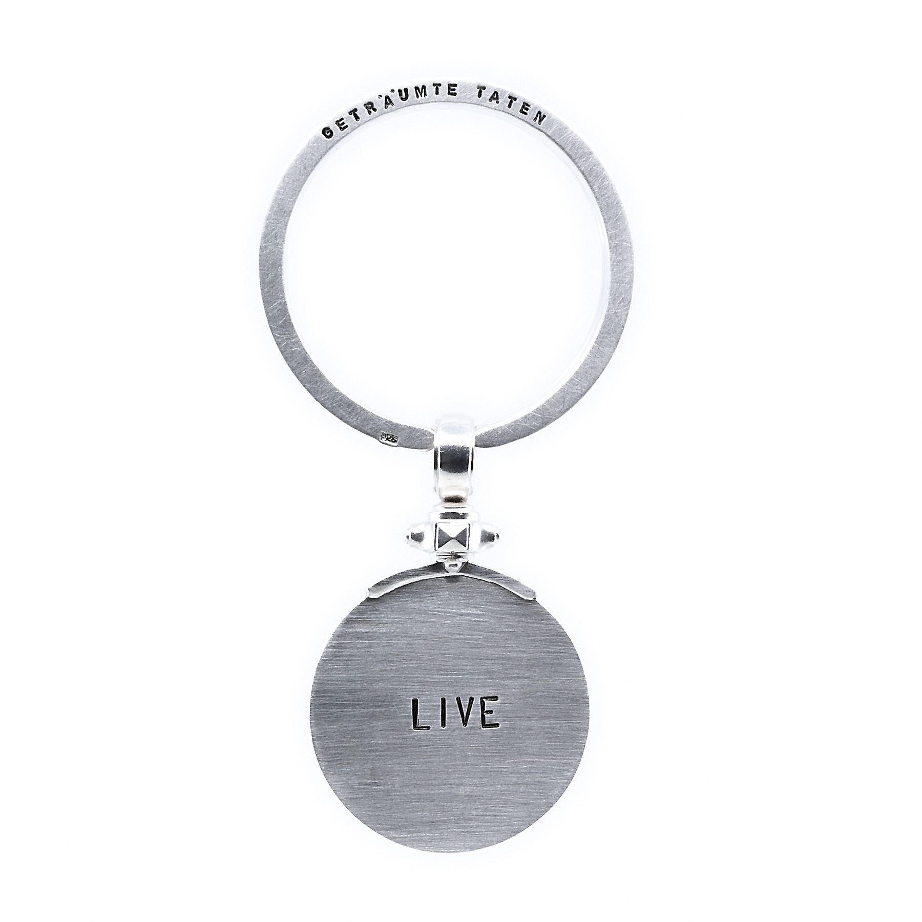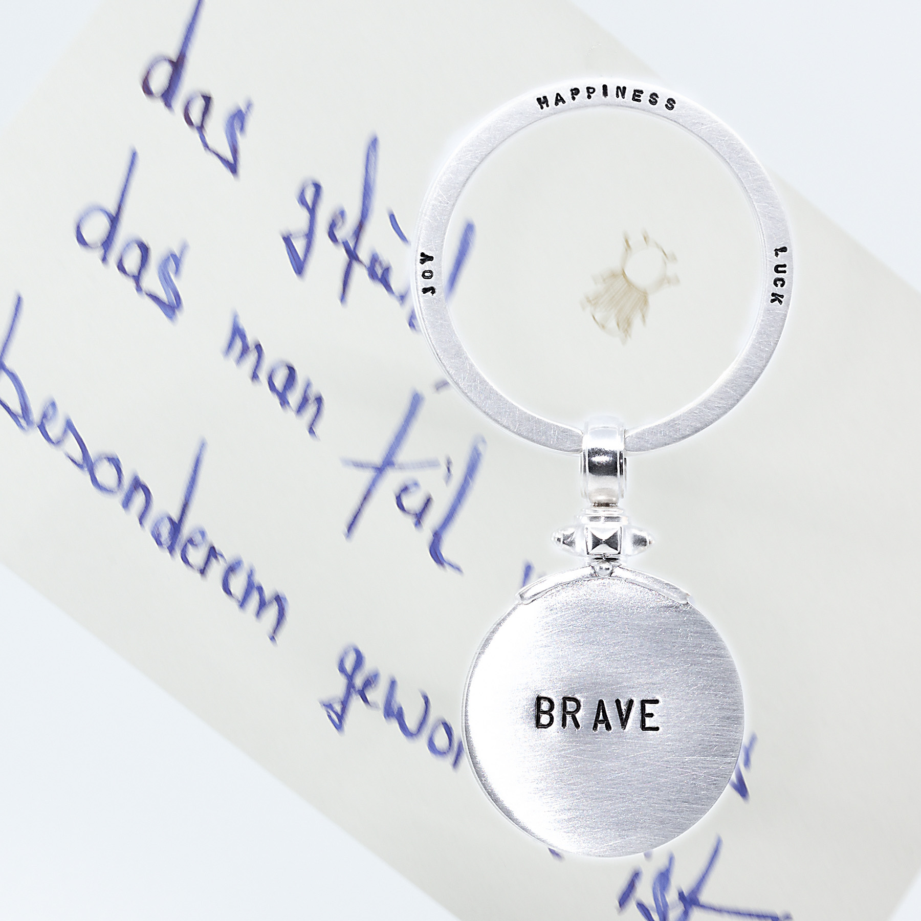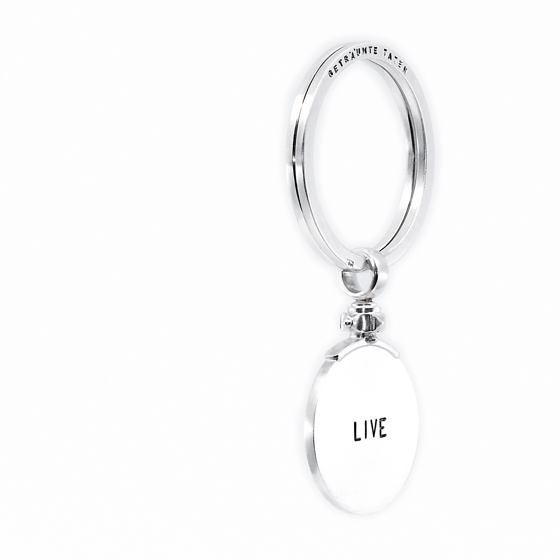 SPALTRING Text von Hand punziert: GETRÄUMTE TATEN Spaltring Rückseite Text von Hand punziert: JOY HAPPINESS LUCK Anhänger Text von Hand punziert: LIVE Anhänger Rückseite Text von Hand punziert: BRAVE