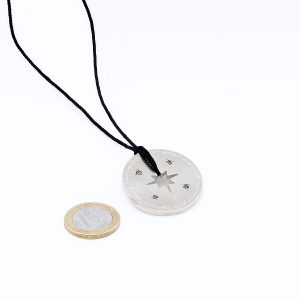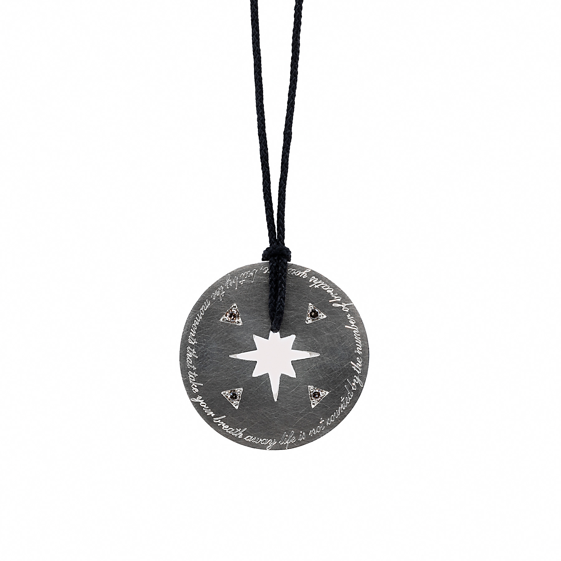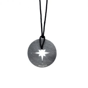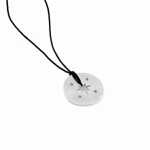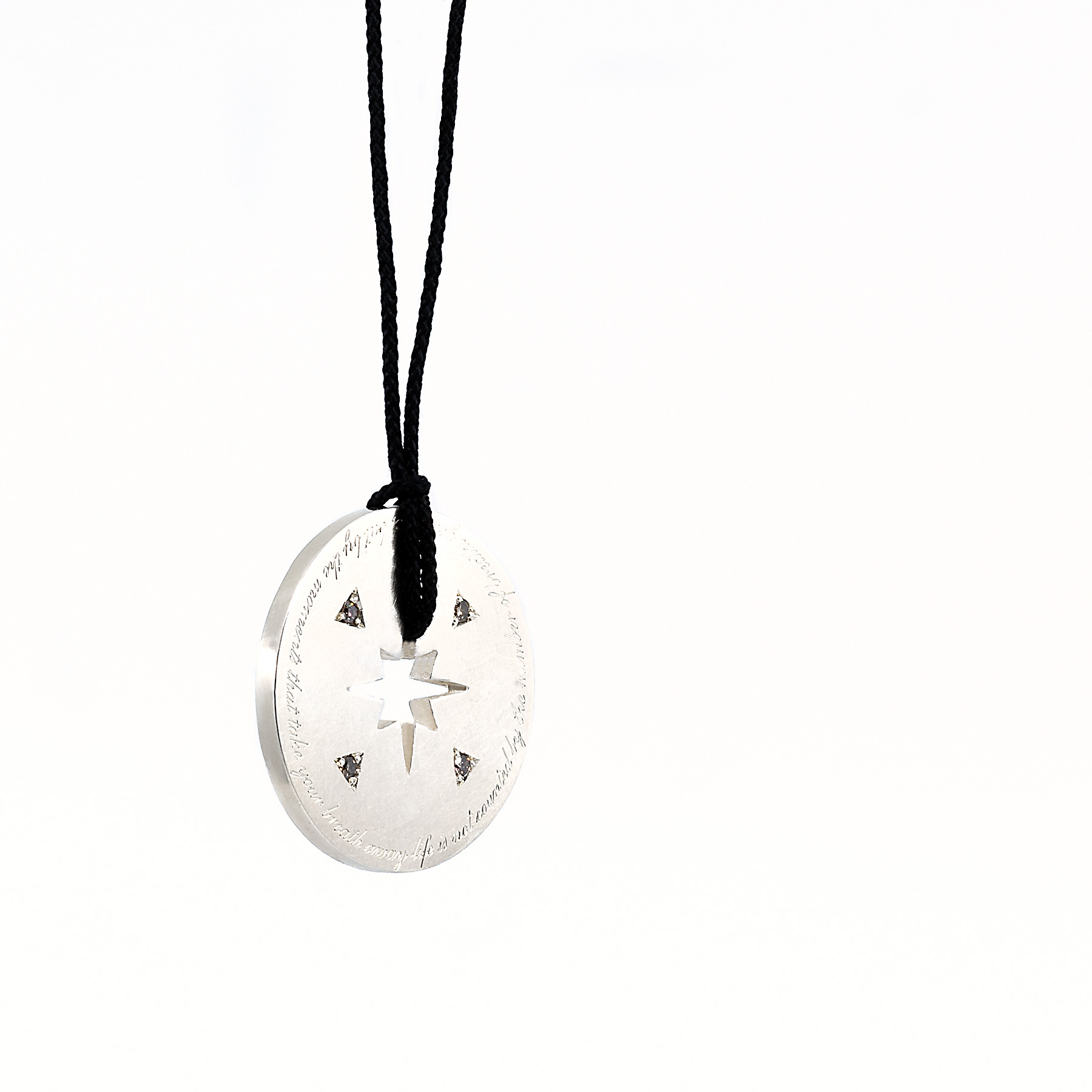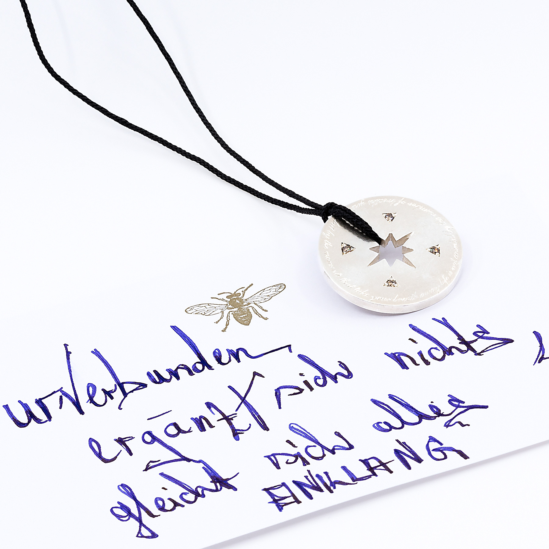 Sterntaler Anhänger grosz 925 SterlingSilber mit 4 cognac Brillanten im Verschnitt gefasst und einer Handgravur auf der Vorderseite sowie einer Punzierung auf der Rückseite mit den vier Himmelsrichtungen an schwarzem dünnen Lederband