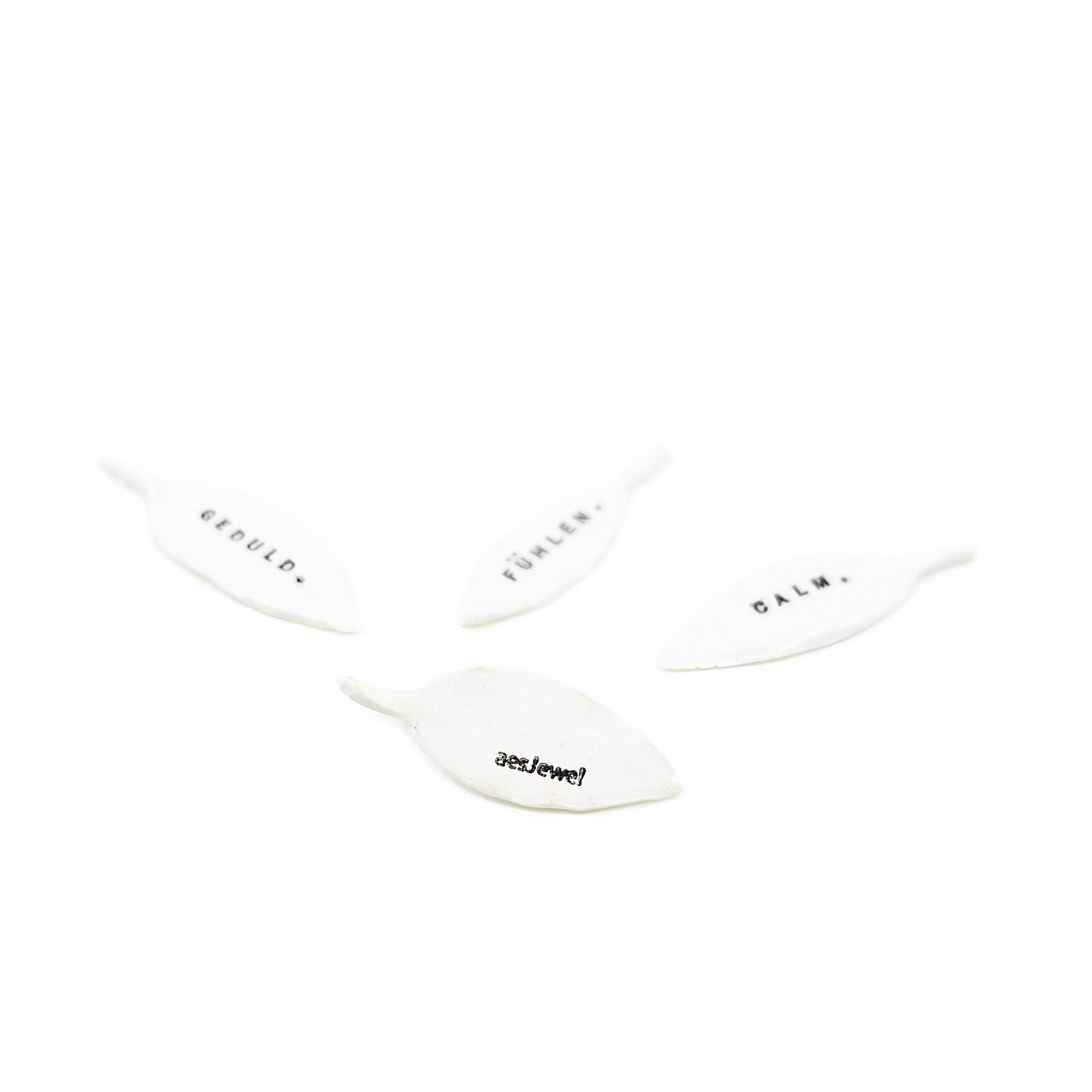Emotion Leaf. Sie sind aus Porzellan. Inspirierende, handgefertigte Blätter mit einpunzierten Sinn-Wörtern zum hinlegen oder zum verschenken als kleine Aufmerksamkeit. Wort: TURN